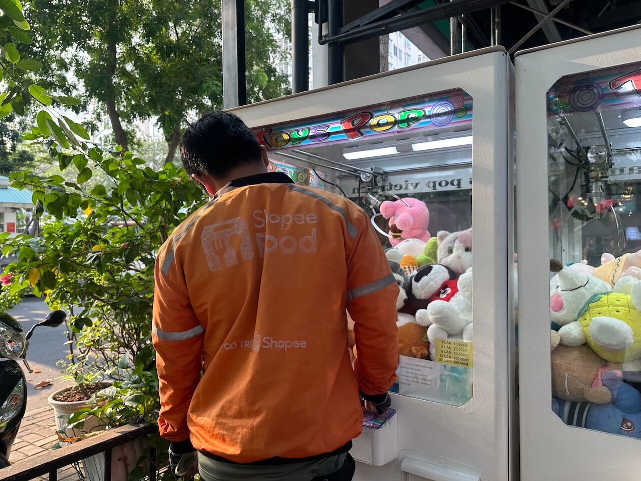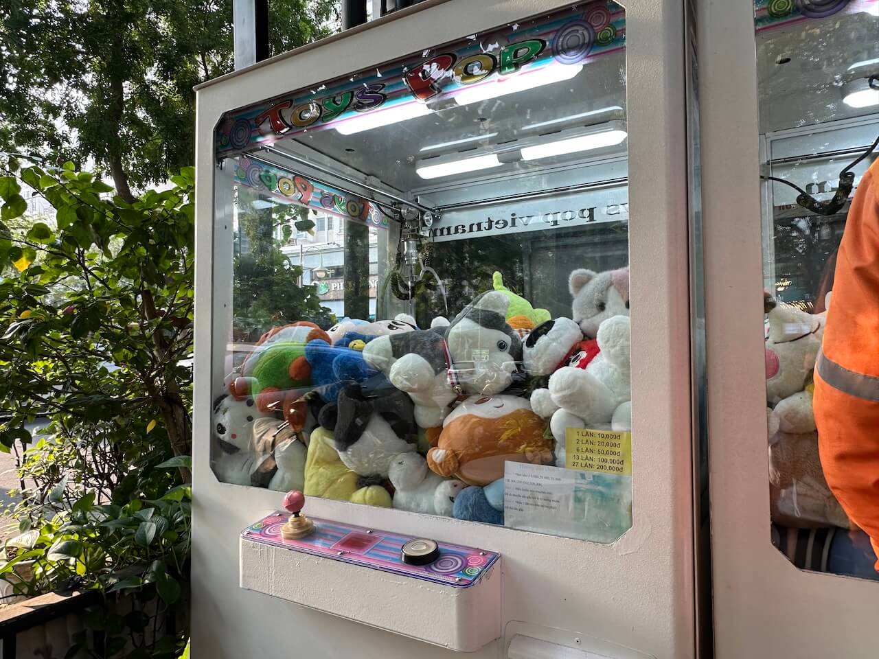 景品がぬいぐるみのクレーンゲーム|アームパワー強めフード配達員: 「10,000VND(約60円)で景品1つをゲットして、60,000〜70,000VND(約360〜420円)で知り合いに販売(転売)してるねん。」
